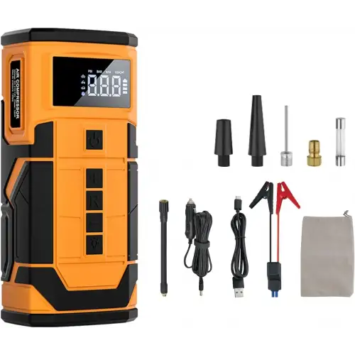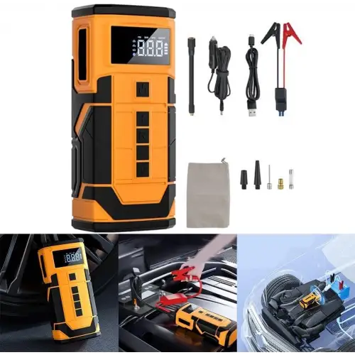 10000mAh 12V araç acil durum başlatma güç bankası 150PSI hava pompası 4'ü 1 arada çok işlevli taşınabilir pil şarj ateşleme atlama marşı. Bu güçlü acil durum güç bankası, acil durumlar için arabanızda bulundurmanız gereken nihai cihazdır. Tek silindirli tasarıma sahip bu taşınabilir araç acil çalıştırma güç bankası, aracınızın hızlı bir şekilde çalışmasını sağlamak için güçlü bir 600 A atlama başlatma sunar.
