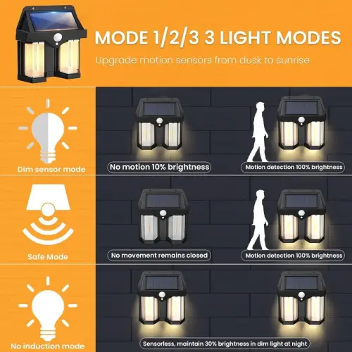 Avlu güneş enerjili şarj edilebilir duvar LED lambası, IP65 su geçirmez lamba, 3 mod ve hareket sensörü, aydınlatma, sokaklar, bahçeler, garajlar vb.