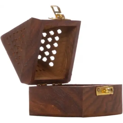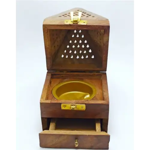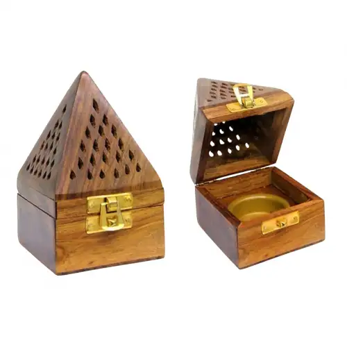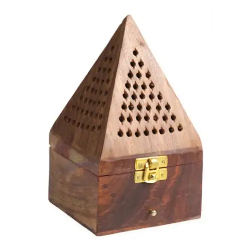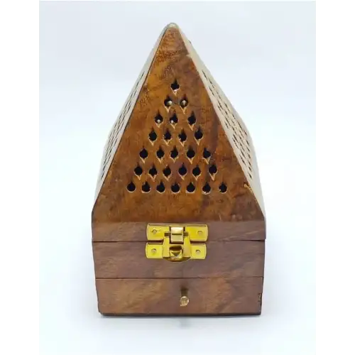 Ürünün dikkat çekici piramit formu, estetik bir görünüm sunarken, dört bir yanındaki özenle delinmiş havalandırma delikleri sayesinde tütsünüzün dumanını zarifçe yayarak hoş kokuların ortamda eşit şekilde dağılmasını sağlar. Ön yüzünde bulunan pirinç kilit mekanizması ve zarif küçük topuz detayı, tütsülüğe otantik bir hava katarken, kullanım kolaylığı da sunar. İç kısmına konik, çubuk veya reçine tütsülerinizi rahatlıkla yerleştirebilirsiniz.