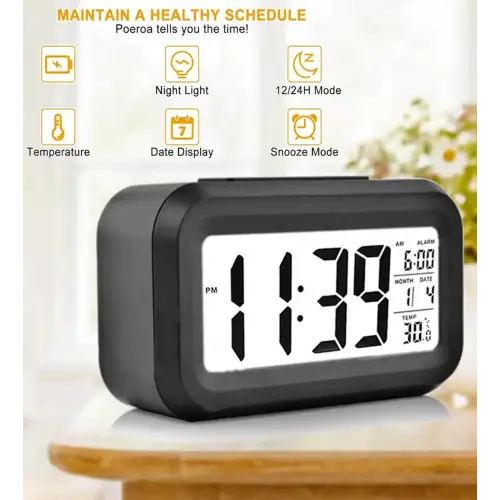 Alarm fonksiyonu ile sabahları zamanında uyanmanıza yardımcı olan bu masa saati, günlük planlamanızı kolaylaştırmak için tarih ve sıcaklık bilgilerini de sunar.