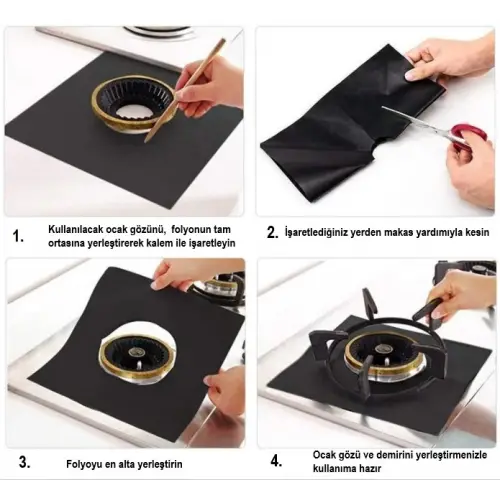 Paket içeriği: 4 adet Ocak Koruyucu Folyo Yanmaz Yapışmaz SiYAH